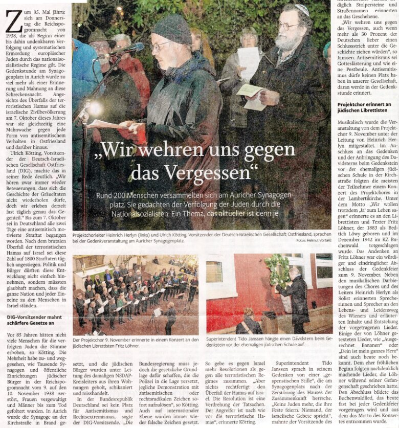 Von 2013 bis 2024 beteiligte sich der "Projektchor Neunter November“ an der Gestaltung der Gedenkfeier zur Reichspogromnacht in Aurich.